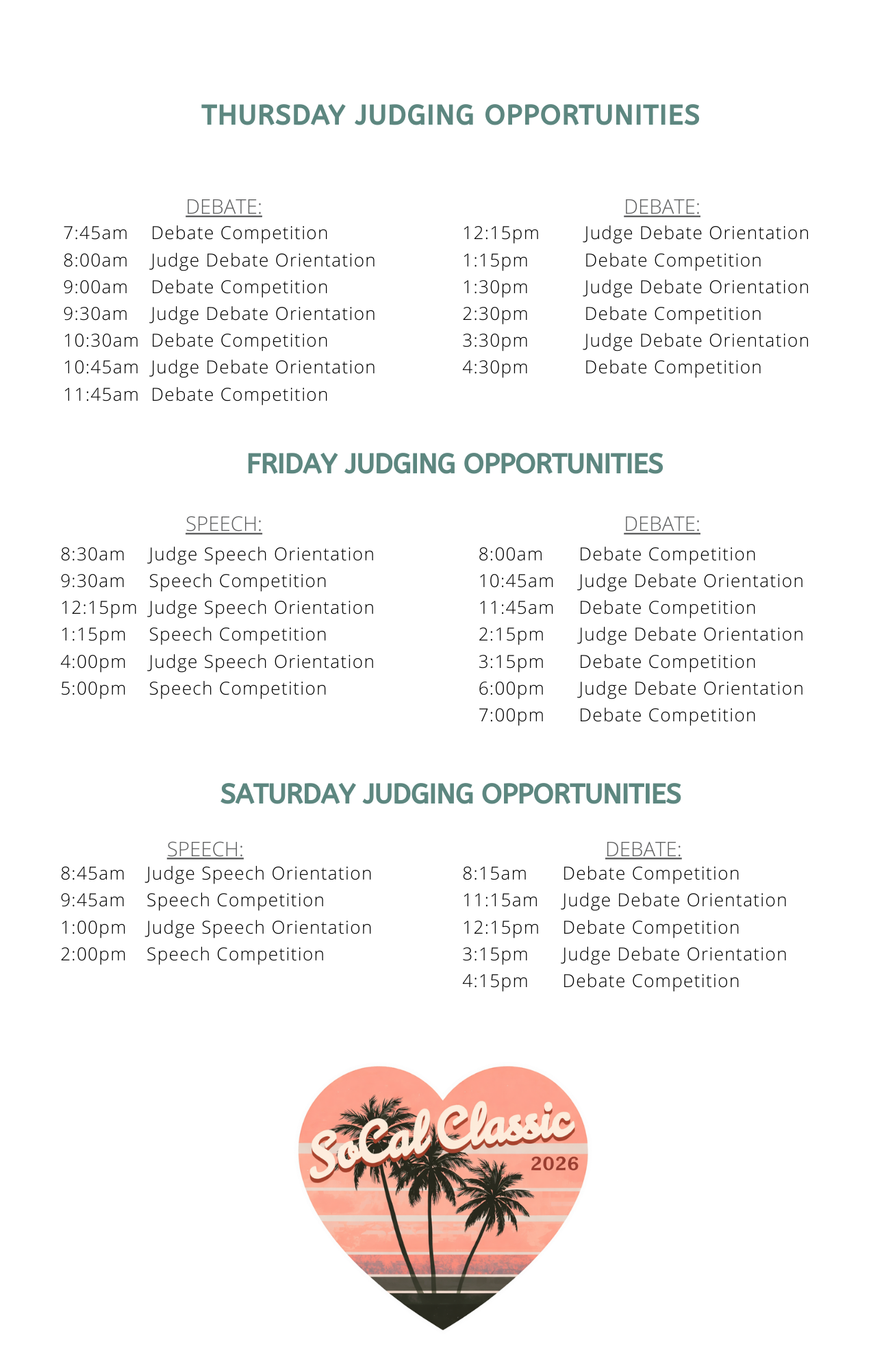 Total volunteer time commitment is approximately 4 hours. Please arrive one hour prior to the round you signed up to judge. This will allow you to attend Judge Orientation prior to your judging round. You are welcome to stay for more than one round!